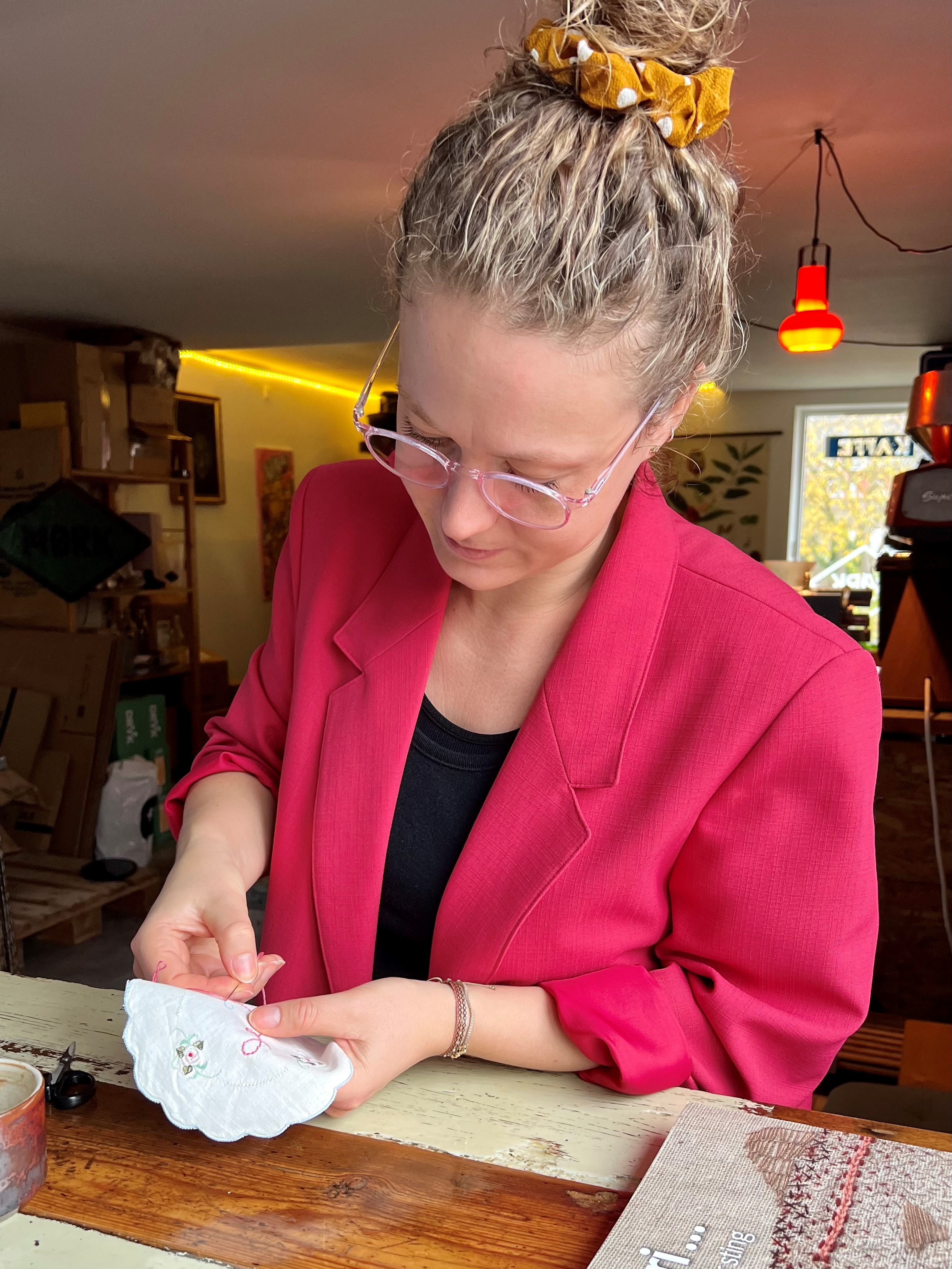 ”Det er en form for meditation for mig at sidde med et sytøj. Samtidig styrker det mit fokus: Én time med stof, nål og perler hver aften gør, at jeg føler et større mentalt overskud næste dag.”