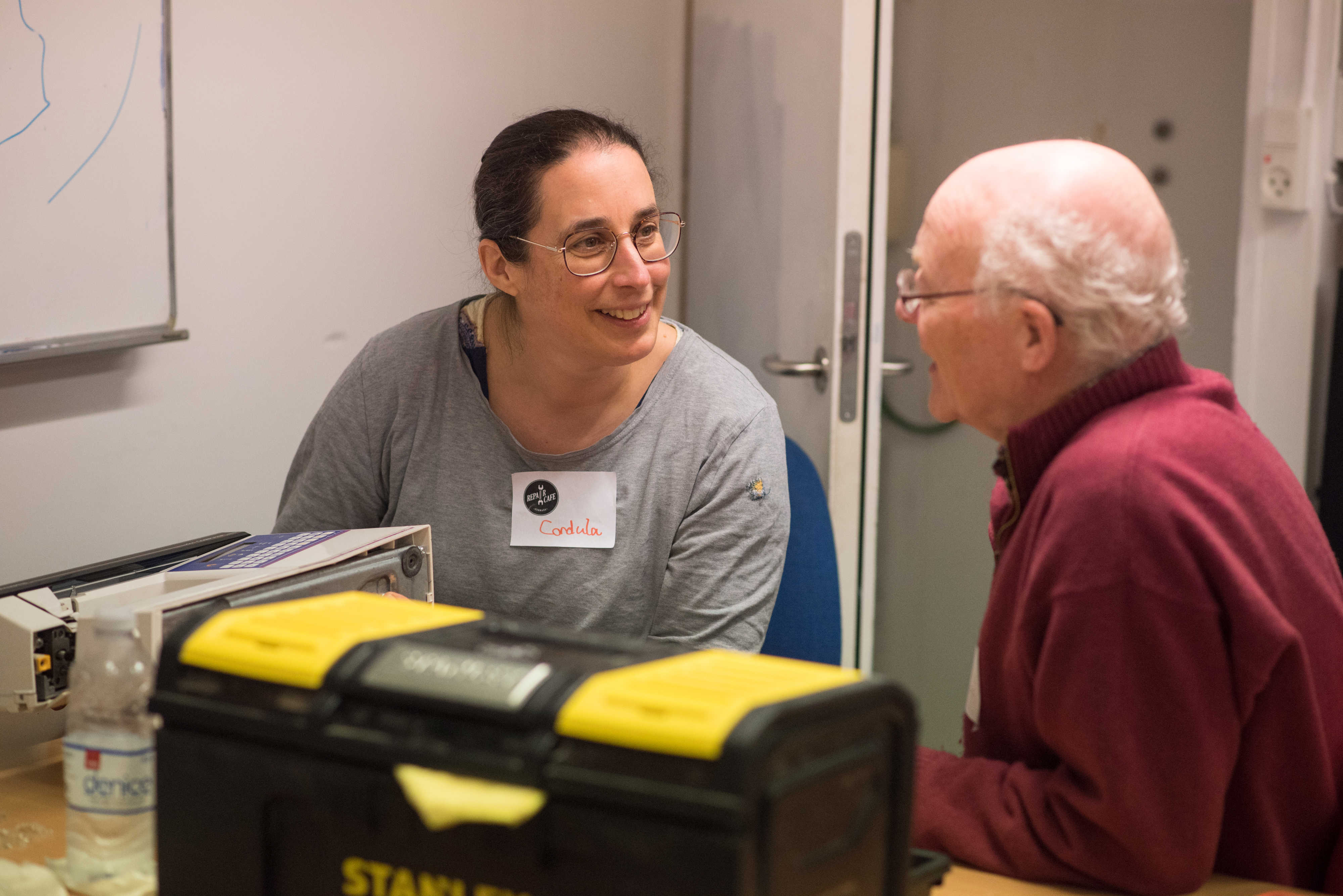 I Repair Caféen flankeres Cordula Göke af et hold erfarne fixere med kompetencer inden for alt fra elektronik til håndarbejde. De står klar med værktøjer til at hjælpe de borgere, der kommer for at få repareret deres ødelagte ting.