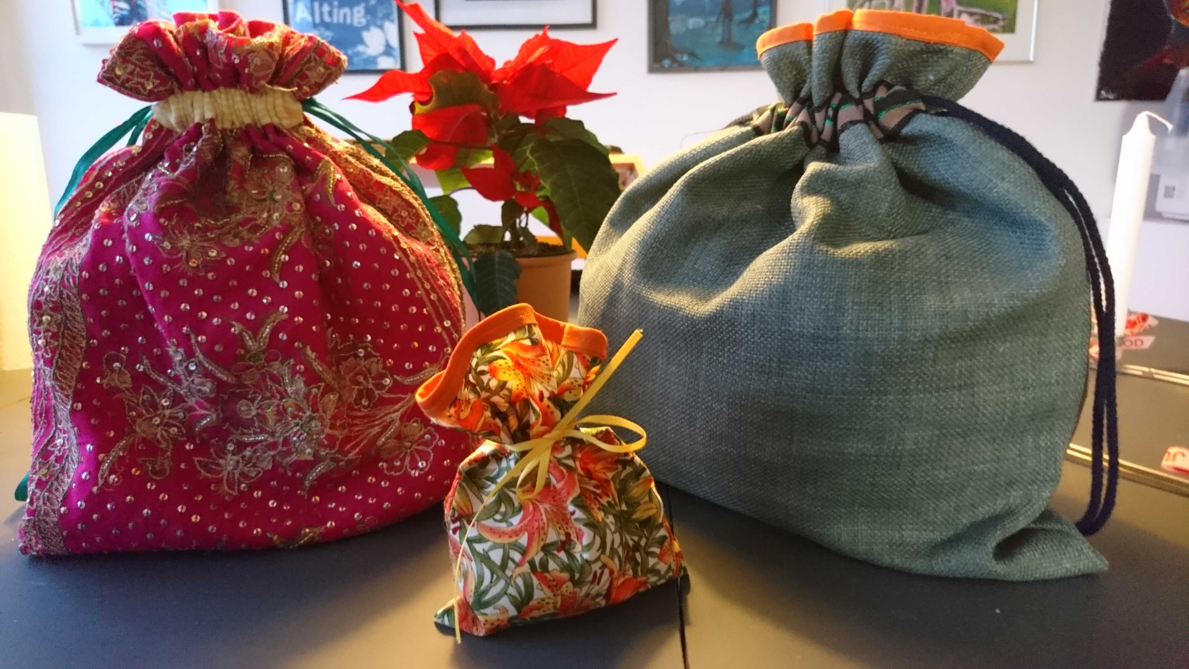 Gennem årene har jeg fået fyldt et skab med hjemmesyede gaveposer i forskellige størrelser, som jeg bruger både i forbindelse med jul, fødselsdage og i andre gavesammenhænge. En gang imellem tjekker jeg op på beholdningen og supplerer med de størrelser gaveposer, der mangler.”- Hvordan fik du idéen til at sy dine egne genbrugsgaveposer?
