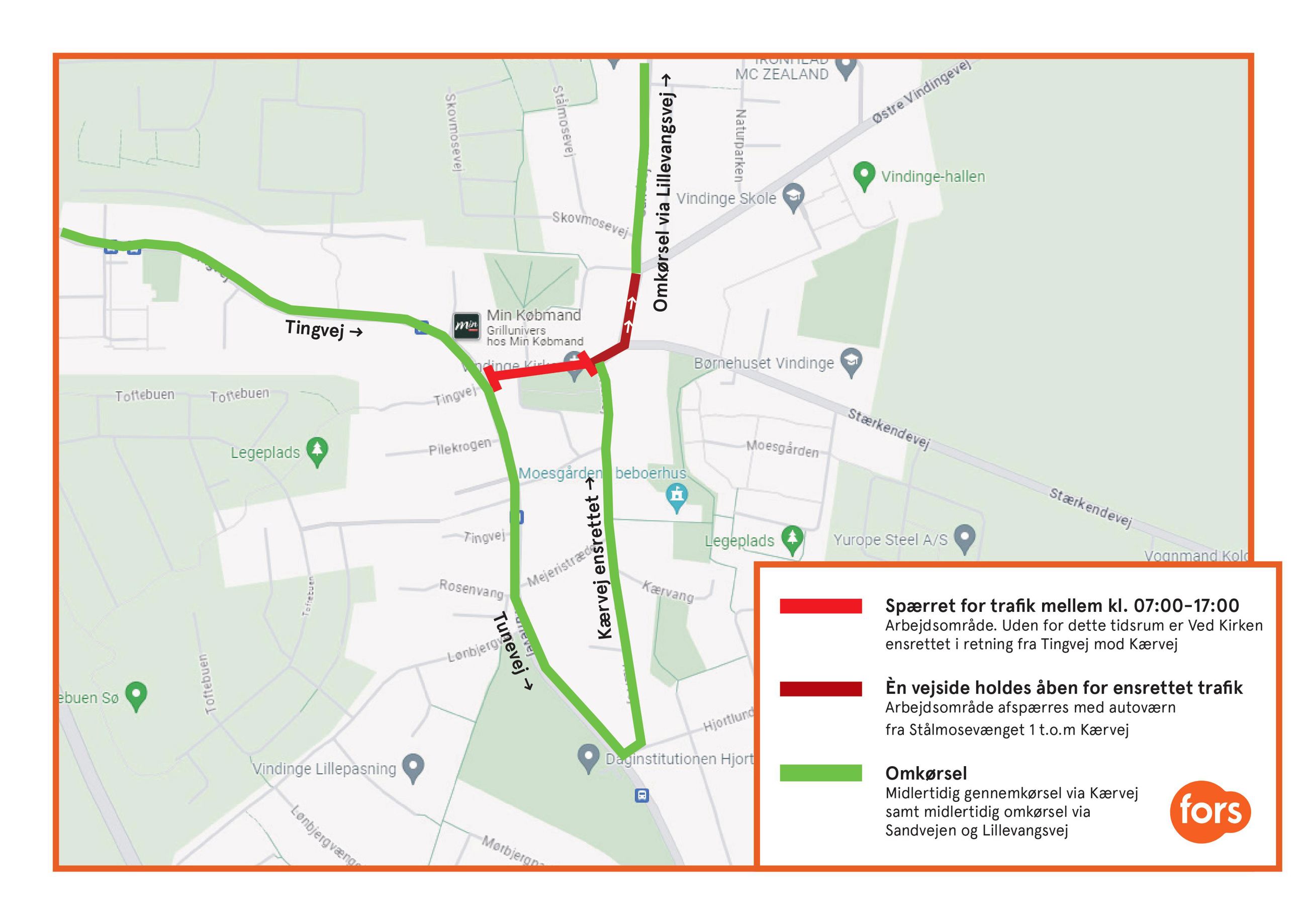 Mandag–torsdag kl. 7-17: Ved Kirken vil være helt spærret for kørsel på strækningen fra Tingvej til lige før Kærvej.