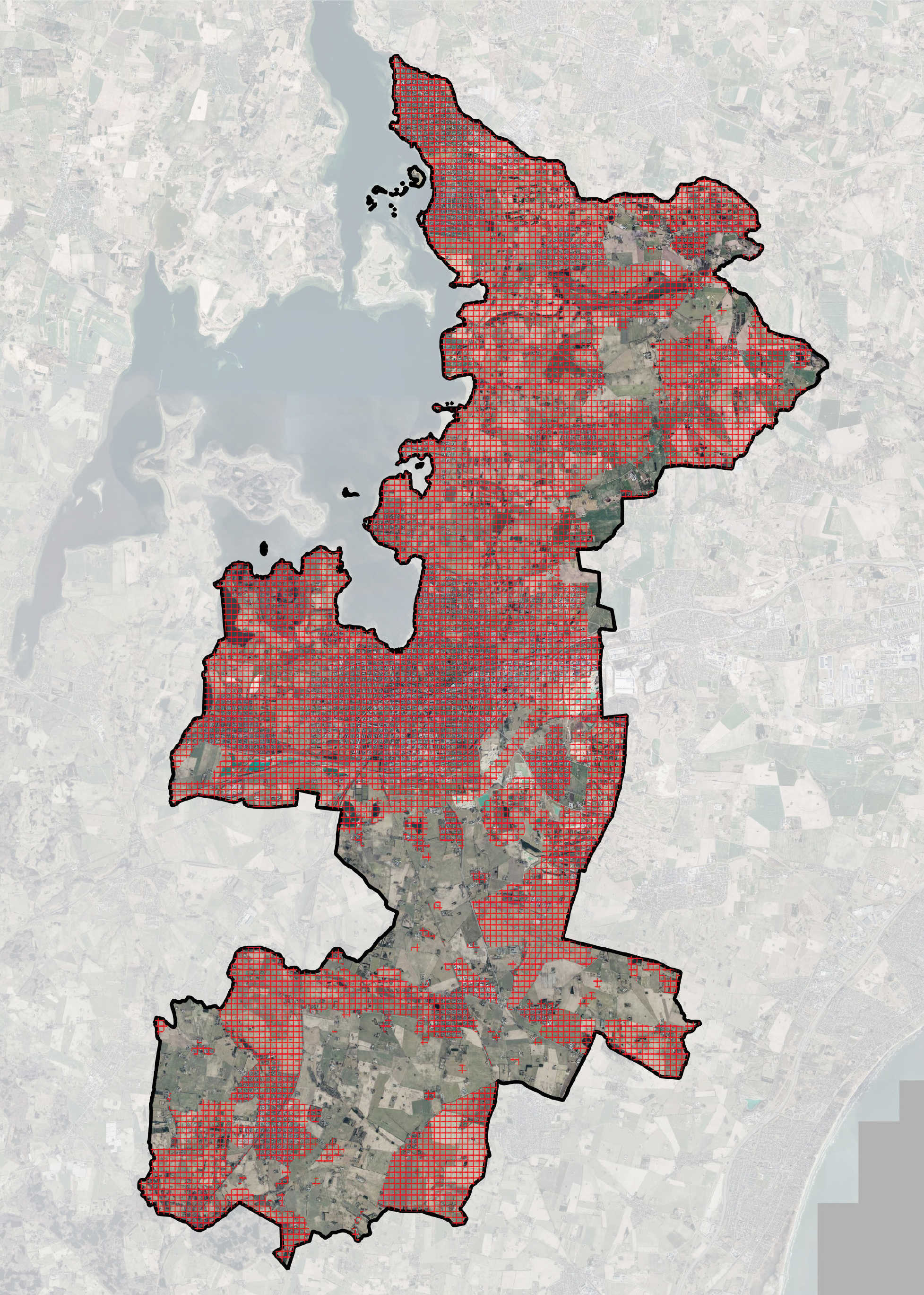 Oplægget til arealer, hvor der IKKE kan opstilles store, vedvarende energianlæg er skraveret med rødt. Entreprenørerne, der ønsker at opstille store, vedvarende energianlæg, skal altså søge inden for de områder, der ikke er skraveret.