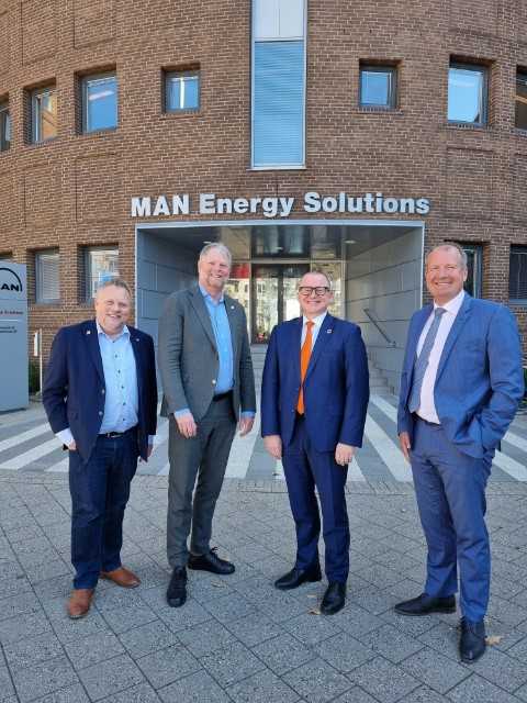 Billedet nederst viser Roskildes Borgmester Tomas Breddam og Erhvervsudvalgsformand Lars Lindskov på besøg hos MAN Energy Solution og Country Manager Bjarne Foldager og Chief Financiel Officer Tommy Andreasen.