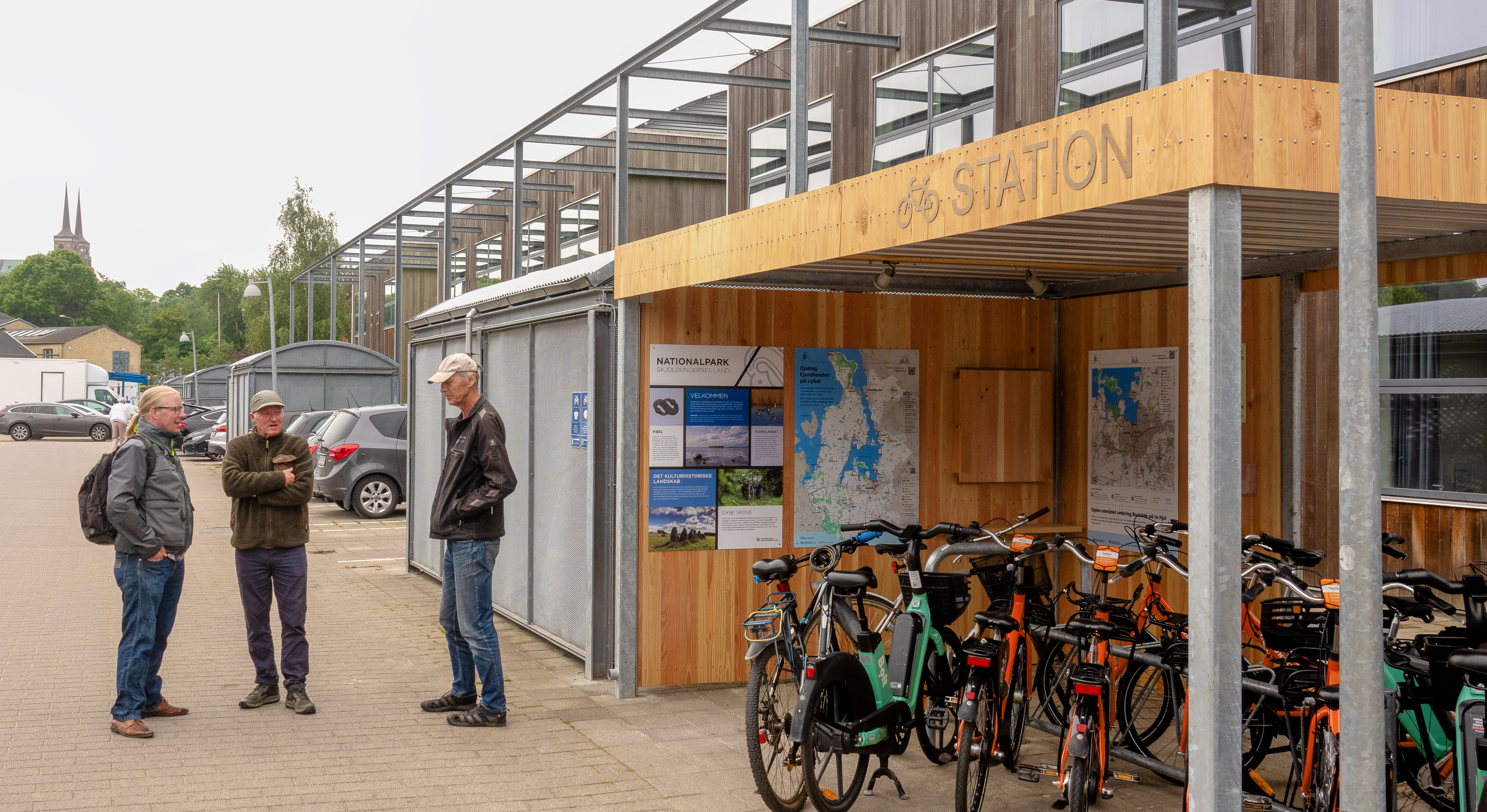 Her kan man leje bycykler, få luft i dækkene, få vand i drikkedunken, låne cykelværktøj og finde information om cykelruter.