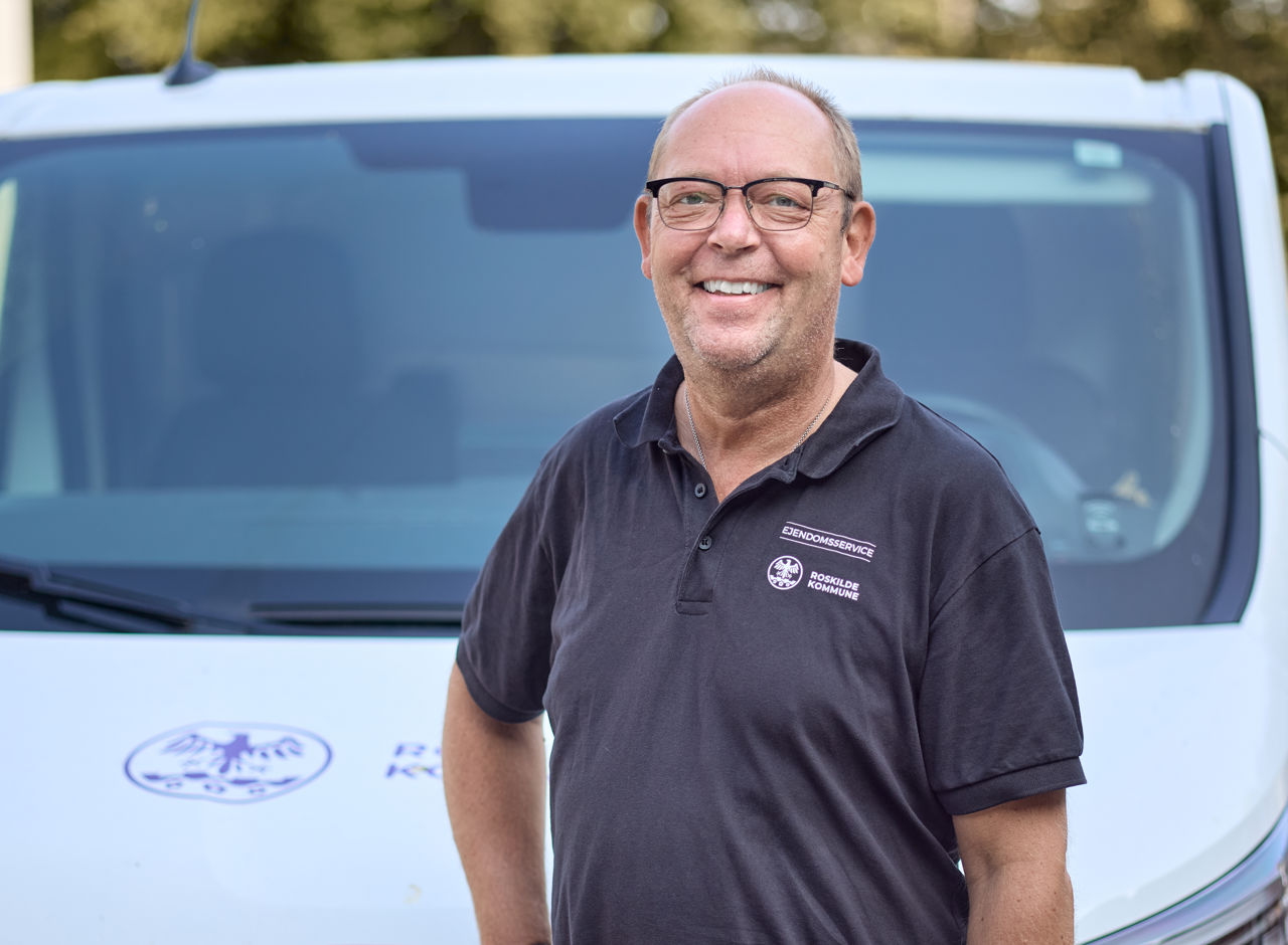 Han er glad for sit job i Roskilde Kommune og prøver også at sprede god stemning hos de personer, han møder på sin vej.