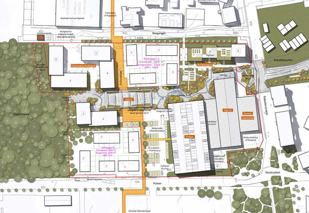 Mellem håndværkskollegiets bygninger er der tegnet små stræder, som fletter sammen med, hvad der kaldes Den Grønne Puls. Det er et øst-vestgående strøg, der binder Musiconlunden i vest sammen med Rabalderparken i øst.