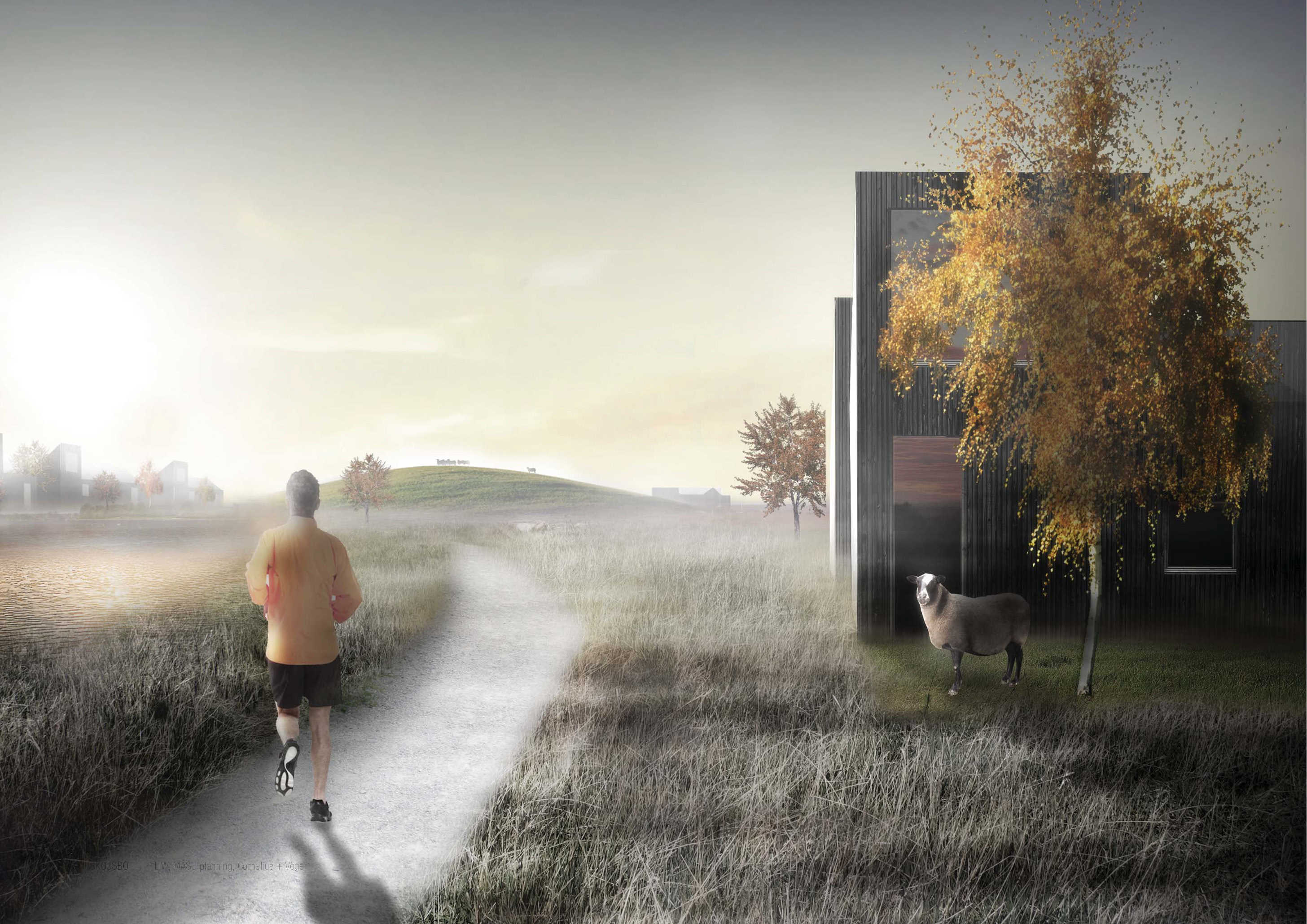 På landskabets højdedrag placeres bebyggelsen orienteret mod den gennemtrængende Syvmosekile. Langs de eksisterende og beskyttede diger, der finder vej ind i gennem området, suppleres beplantningen med nye træer, der skal vokse op til at blive en stærk, grøn stuktur, som forbinder Skousbo på tværs.