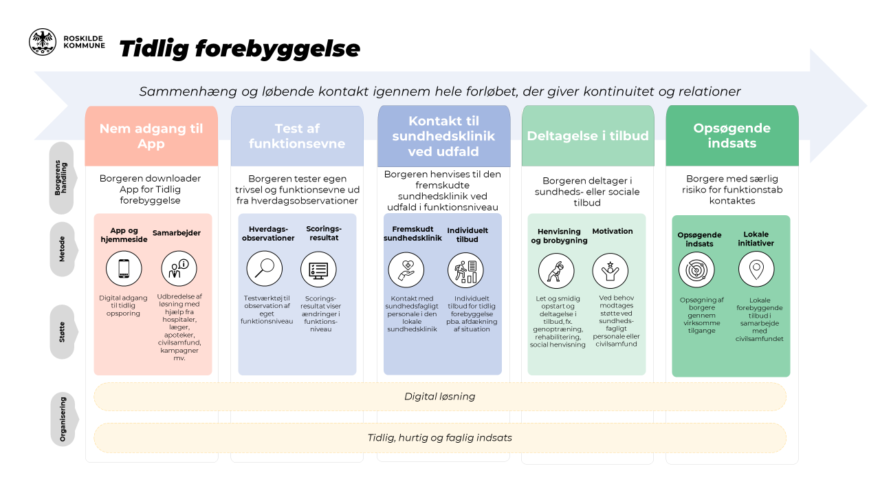 Roskilde Kommune er i gang med at udvikle Tidlig forebyggelse i samarbejde med borgere, pårørende, medarbejdere, Ældrerådet og civilsamfundet. Tidlig forebyggelse indebærer: