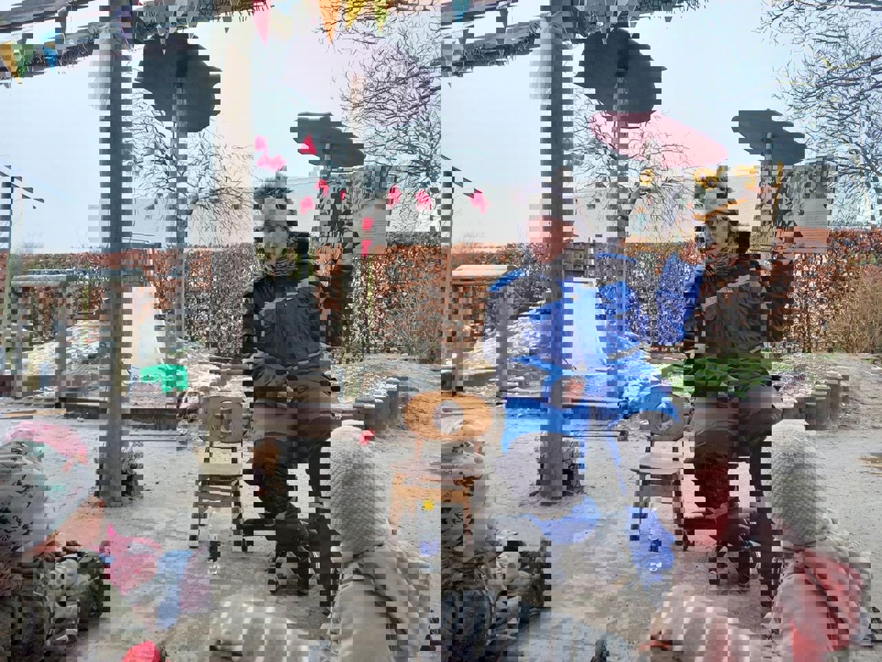 Vi vægter stor brug af uderummet og har indrettet værksted på legepladsen, hvor børnene kan tilgå kreative materialer og være skabende. Vi har et bålhus og køkkenhaver og høster gerne sammen med børnene, så de ser processen fra jord til bord. Vi er ved at skabe et stykke eng på plænen, for at lære børn om biodiversitet.