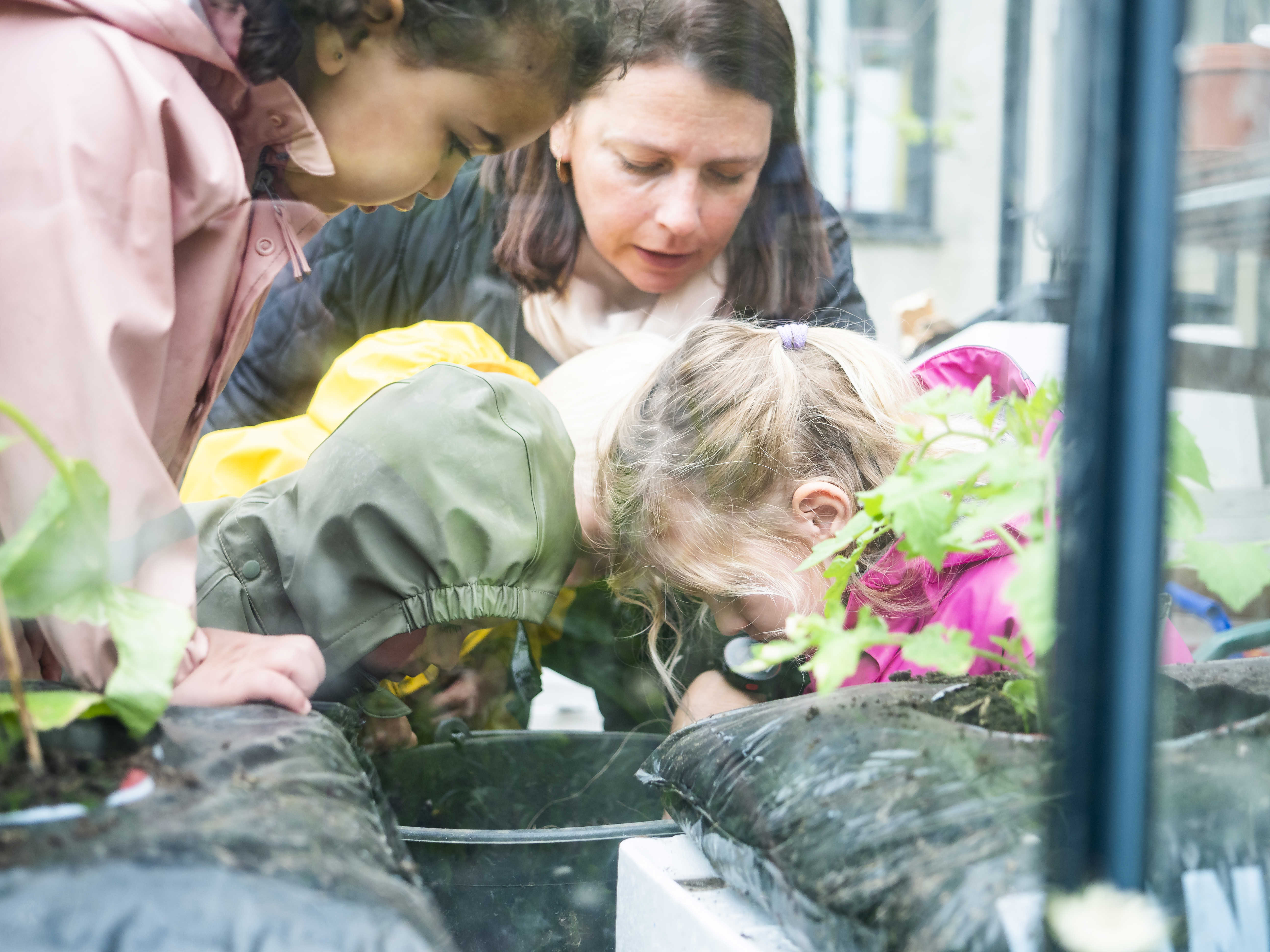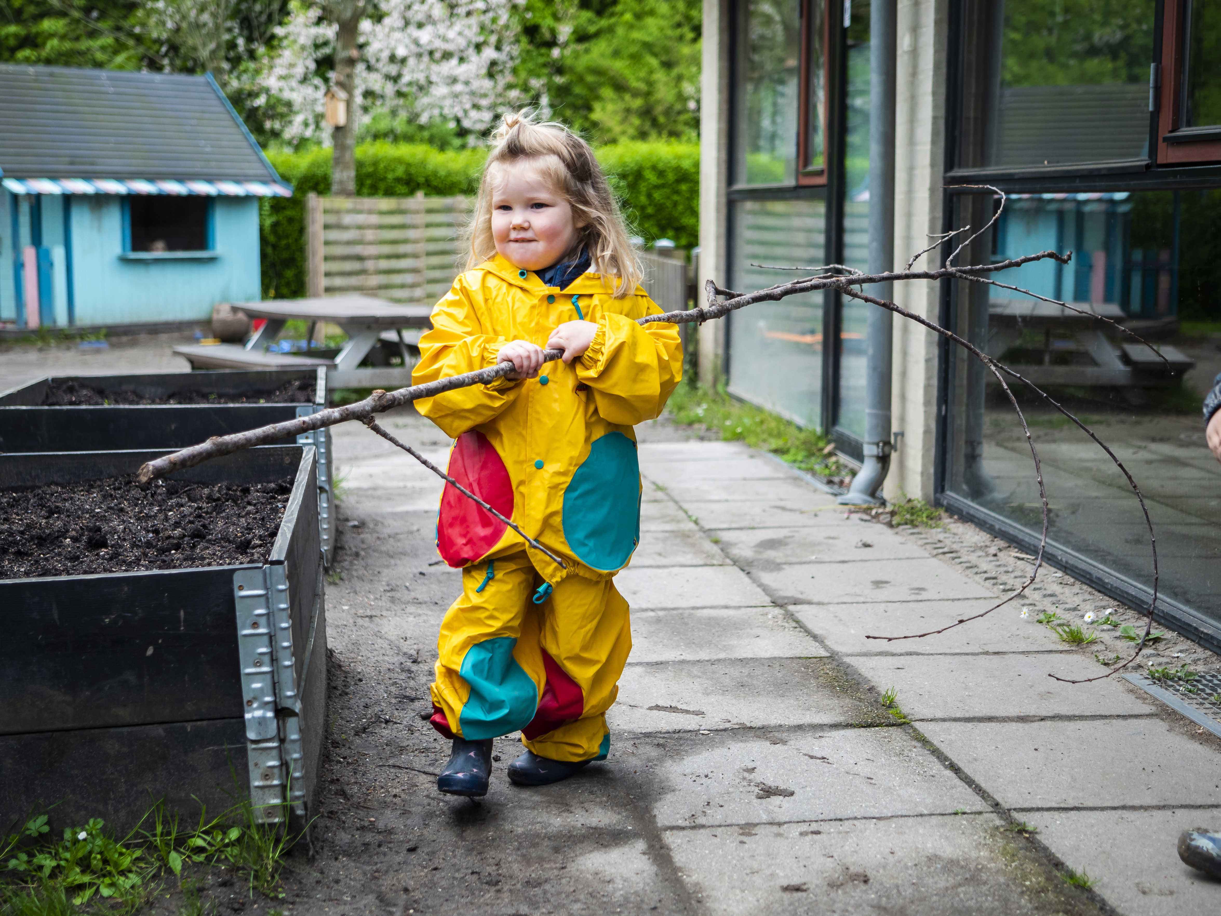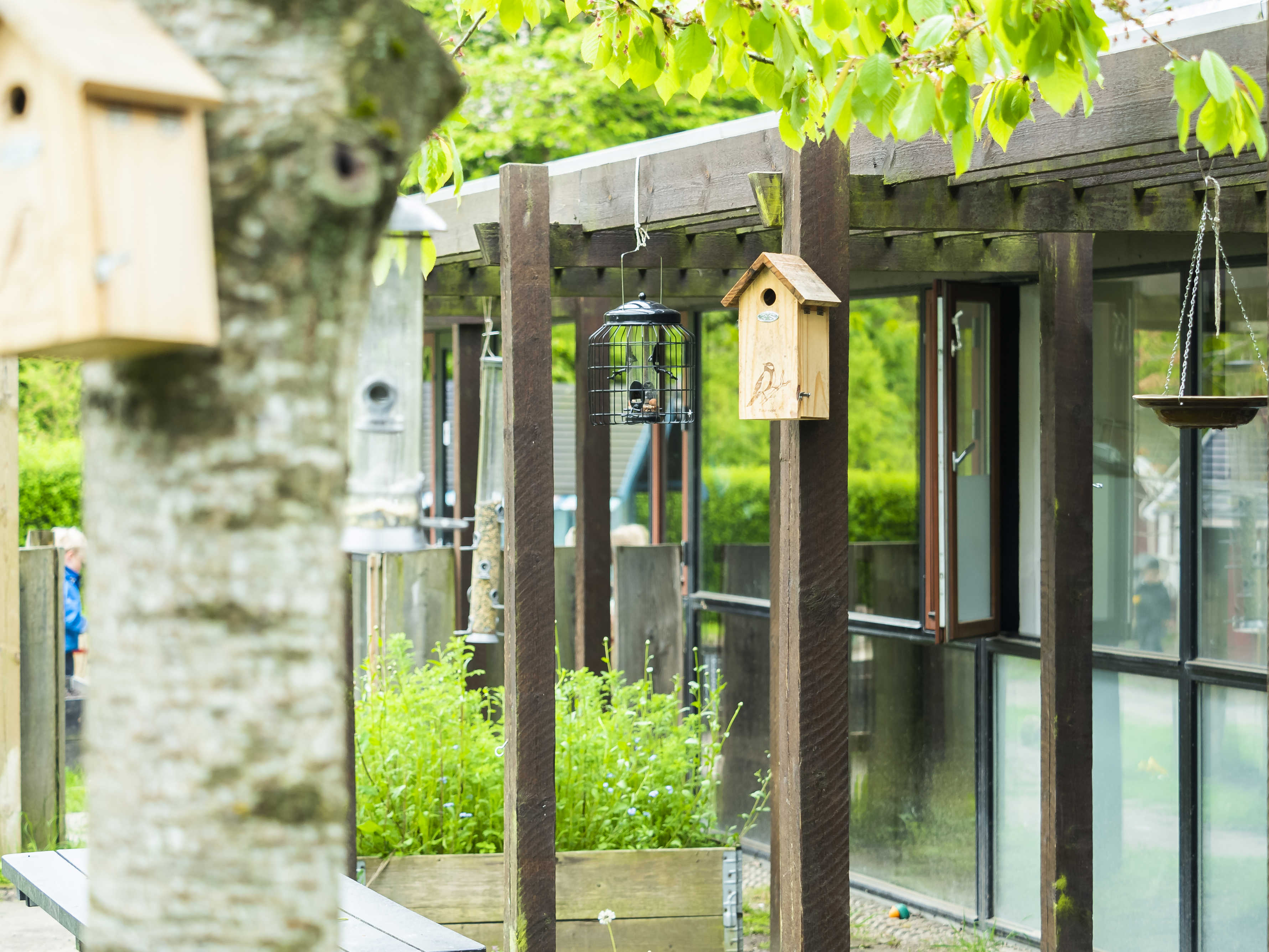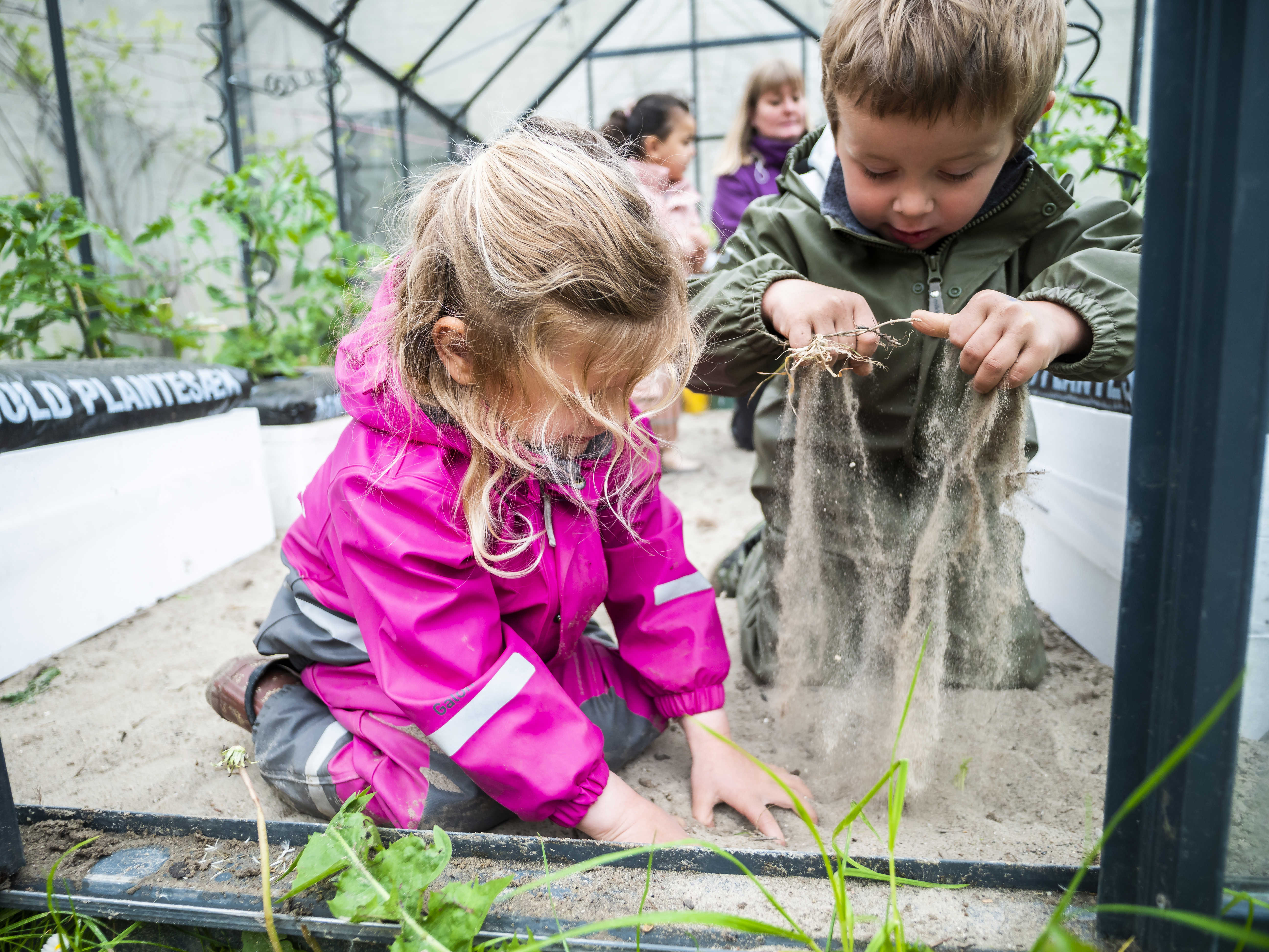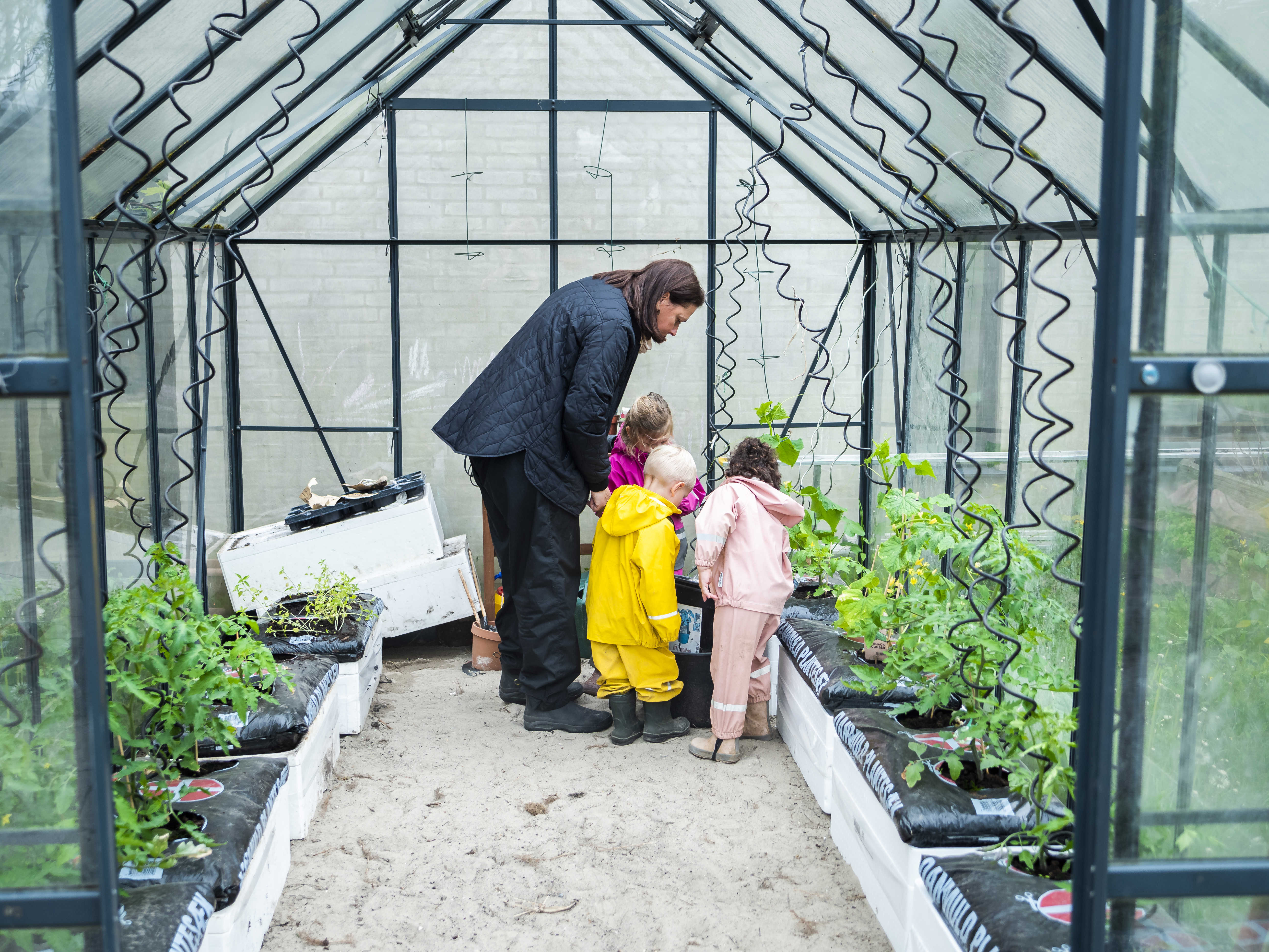 Vi er ude mange timer hver dag med børnene og vores legeplads er blandt andet indrettet med højbede, sansehave og drivhus.