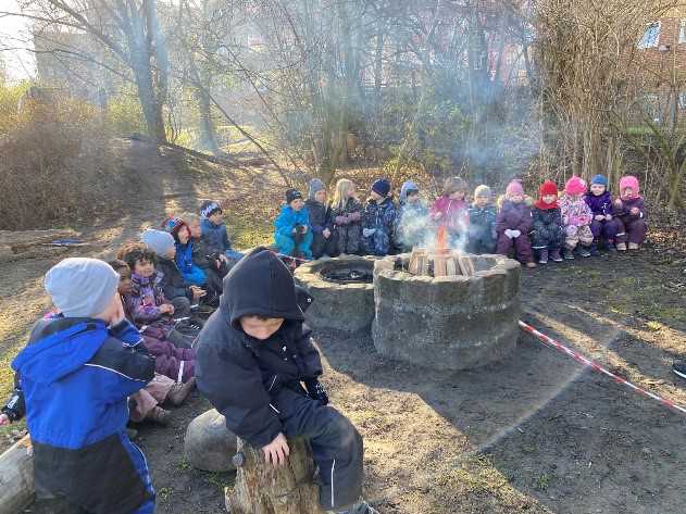 Vi har byens bedste legeplads, der tilbyder mange forskellige udviklingsmuligheder med grønne træer og buske, der skaber rum, hvor børn kan lege uforstyrret, bålhytte, hvor vi varmer os, når det er koldt og bålplads, hvor vi sammen laver mad. Vi hjælper hinanden med at passe på vores legeplads og inddrager børnene i, hvordan vi passer på træer, blomster og græs.