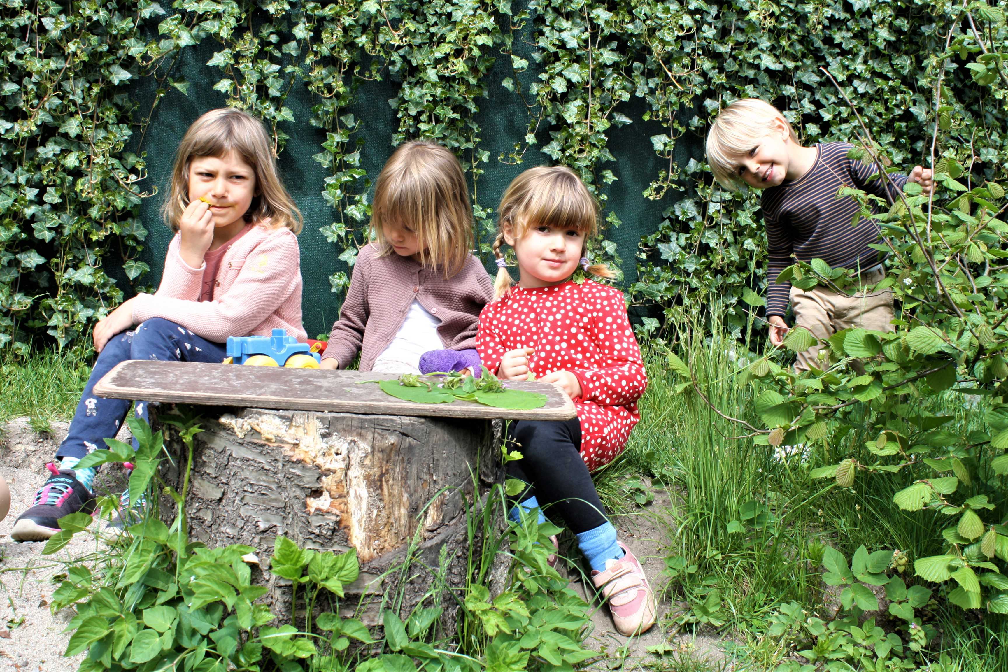 Børnehaven har et stort bålhus, som vi flittigt bruger i al slags vejr. Vi har også ”mormors kolonihavehus” på vores legeplads, hvor vi ofte leger, spiser og har forskellige aktiviteter. Vi har en stor legeplads med mulighed for at klatre i træer og bygge huler. Vi er kreative og nysgerrige i naturen, og det er børnenes legeplads med plads til fantasi, kreativitet og fordybelse.