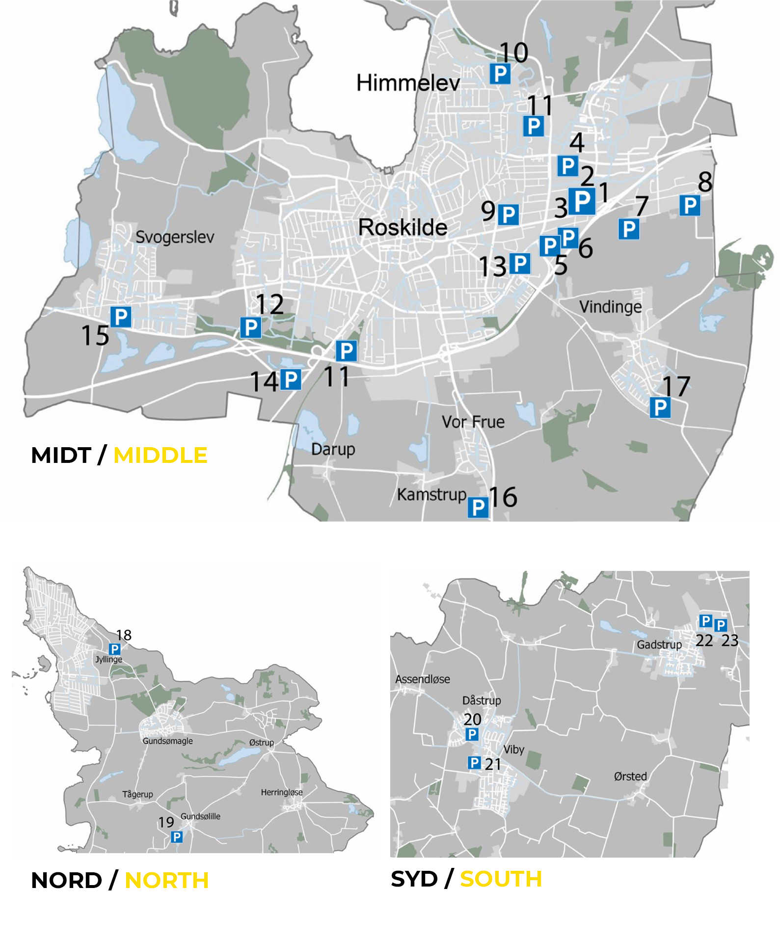I Roskildes bymidte og Musicon er der parkeringszoner. I Jyllinge og Viby er der centrale parkeringspladser ved indkøbscentrene.
