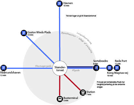 Vær opmærksom på, at visse pladser i bymidten er private, hvor der gælder andre regler. De er markeret med sorte skilte ved p-pladserne og med lys blå farve på kortet nedenfor.