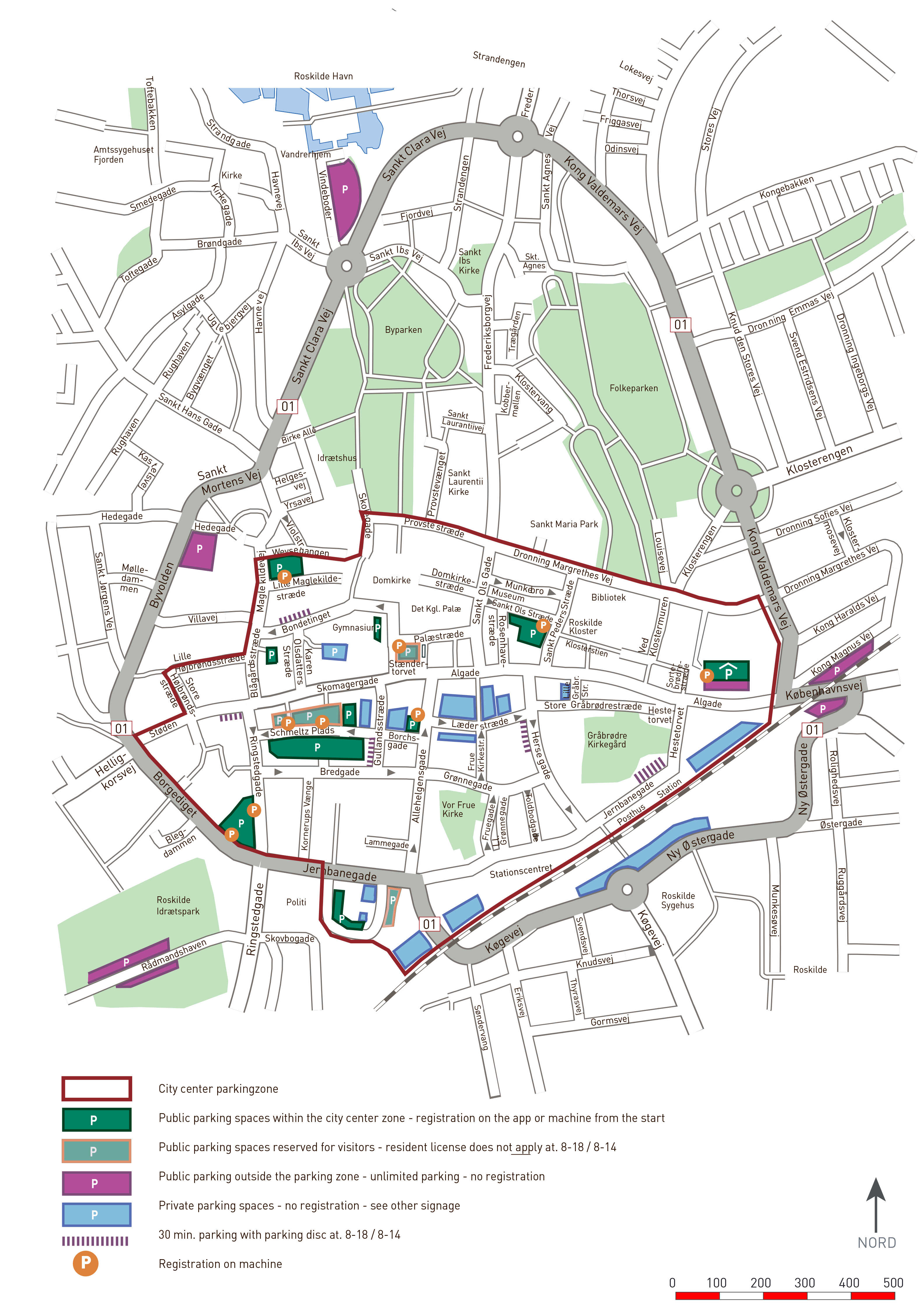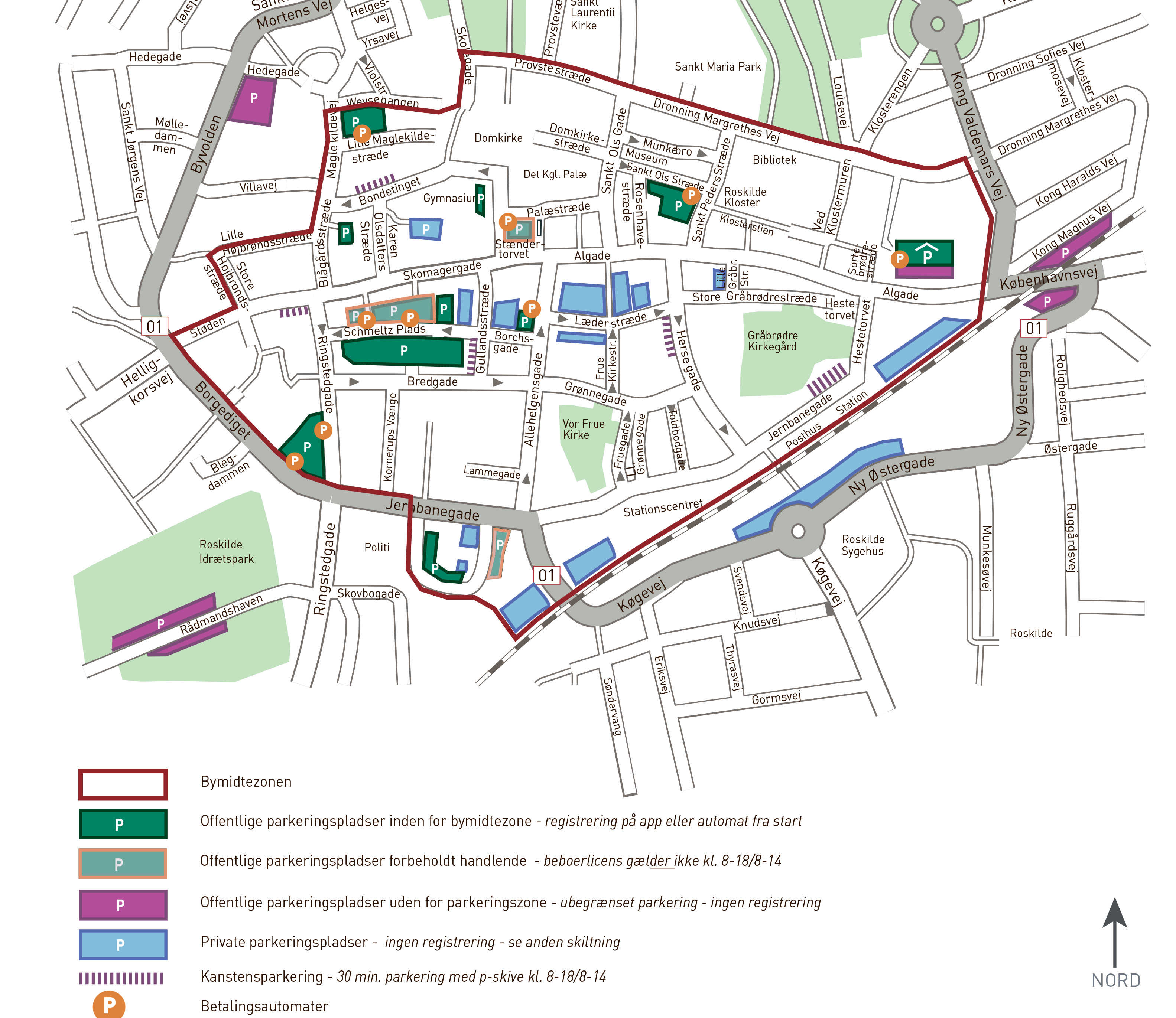 I Roskildes bymidte er der 2 timers gratis parkering og mulighed for at købe ekstra tid på de kommunale p-pladser.